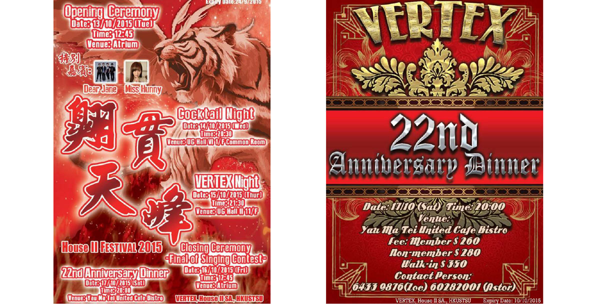 My work when I was the Promotion Secretary of VERTEX, House II Student Association, HKUSTSU. Most posters are red in color as it is the theme color of our association.